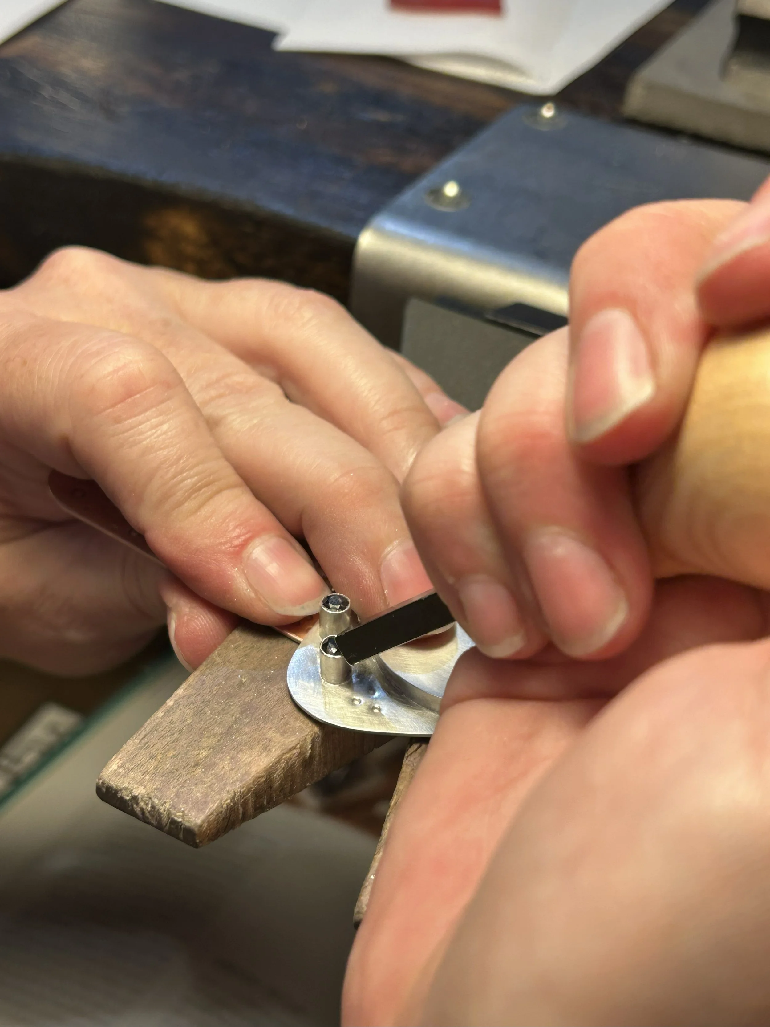 Learn the fundamentals of stone setting in this 18-hour introductory course (+lunch breaks) designed for beginners. Explore essential techniques including bezel, prong, tube, and flush settings. Through hands-on practice, students will develop precision, control, and confidence while working with basic tools and materials. All tools and materials provided. All skill levels welcome. We encouraged taking Intro to Jewelry + Metalsmithing first, but not required.